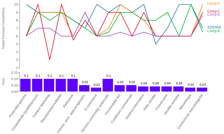 Per ogni competitore analizzato è tracciata una linea che congiunge i diversi punteggi attribuiti. In questo modo è possibile vedere in modo immediato in quali fattori competitivi l'azienda analizzata ha un gap rispetto ai concorrenti e in quali invece ha una posizione di vantaggio.