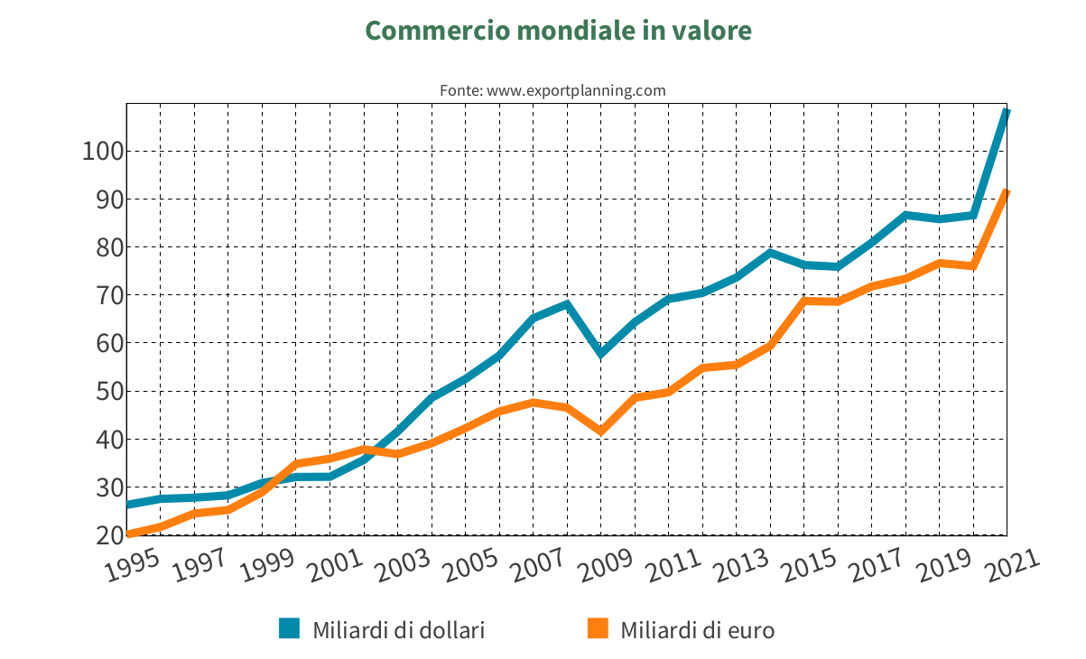 Lo scorso anno, la domanda mondiale ha toccato i 92 miliardi di euro, e si prevede una prosecuzione dei ritmi di crescita per i prossimi anni: secondo i dati ExportPlanning, il tasso di crescita medio annuo degli scambi mondiali potrebbe superare il 7% nel periodo 2022-2025.